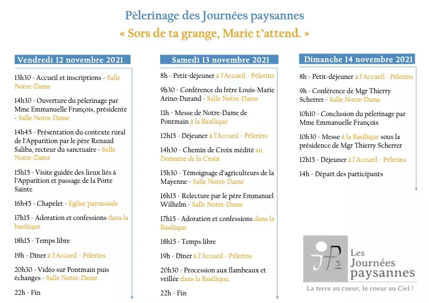 Programme du Pèlerinage des familles paysannes à Pontmain de Novembre 2021