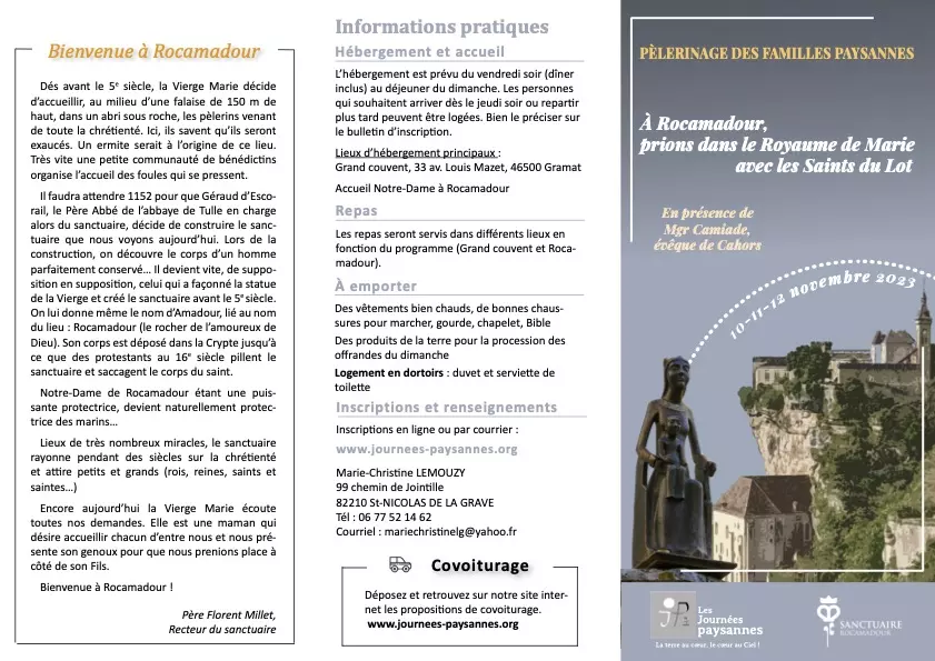 Programme du Pèlerinage des familles paysannes à Rocamadour de Novembre 2023